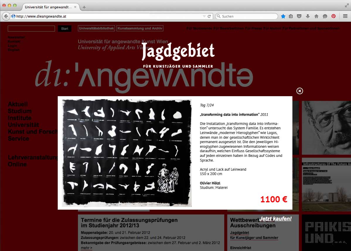 Online exhibition Design, photography, fine arts, fashion, architecture, music — Jagdgebiet was exhibited prominently in a pop-up window on the homepage of dieAngewandte ⤑ and in its own web gallery ⤑